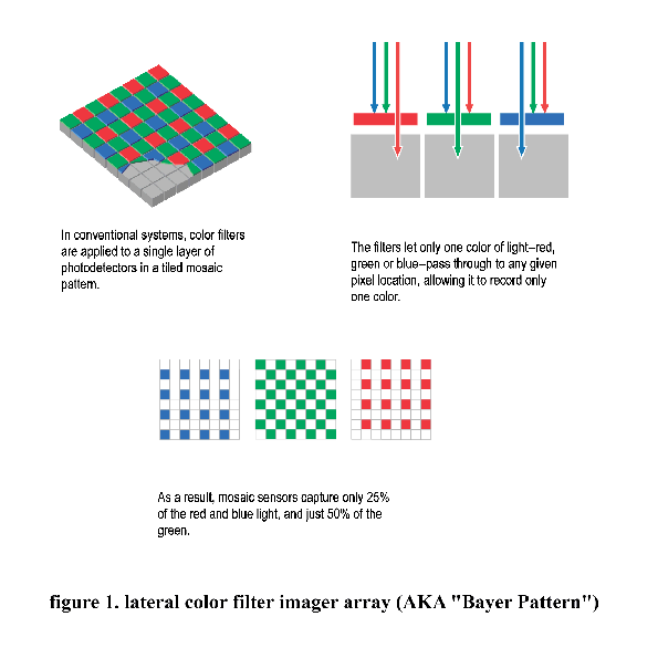 3) LATERAL COLOR FILTER. An array of transparent color filters is arranged over the photodetector array, so that different photodetectors sample different colors, as well as different spatial locations. The most common form of color detector used in consumer electronic imagers today, often called "Bayer pattern" after its inventor (see US patent number 3,971,065). The normal output file for this type of pixel interpolates color values for all the physical photosites, requiring many assumptions about the local image characteristics, as well as complex calculations.