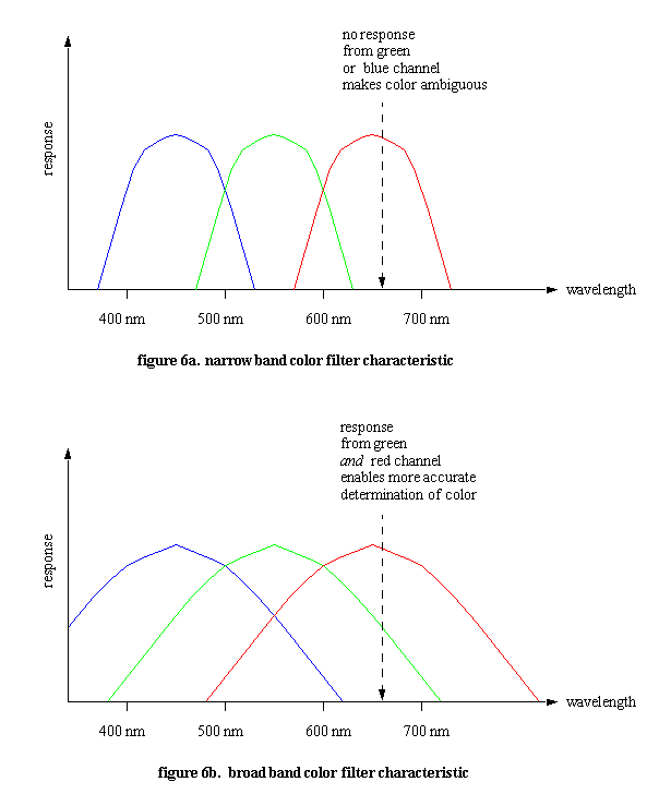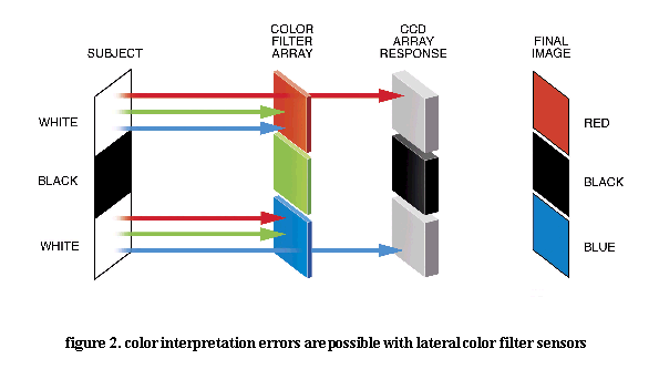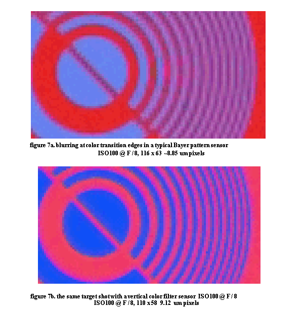 As seen in figure 7b, the same color transitions are rendered with less use of neutral color when the vertical color filter sensor is used, so the resulting image has more of the real color that was present. In scenes of objects with many color transitions, such as grains of sand on a beach or tree leaves, this reduction of incorrect colors near edges can amount to a significant amount of the scene content, enough to cause a noticeable difference in subjective color perception for the image. CONCLUSION We have described four basically different techniques for doing color separation in digital cameras, each of which has advantages and disadvantages which make it more, or less, suitable for different applications. Of these techniques, only the single chip lateral or vertical color filter method is practical for consumer cameras. The vertical color filter has the basic physics advantage of capturing more information per unit sensor area than the lateral color filter sensor. But the lateral color filter sensor has less overhead, in cases where having all color information in each photosite available does not contribute to image quality. In the ultimate (future) camera design with diffraction limited resolution, and photon capture cross section limited signal to noise, then the vertical color filter will have an advantage.
