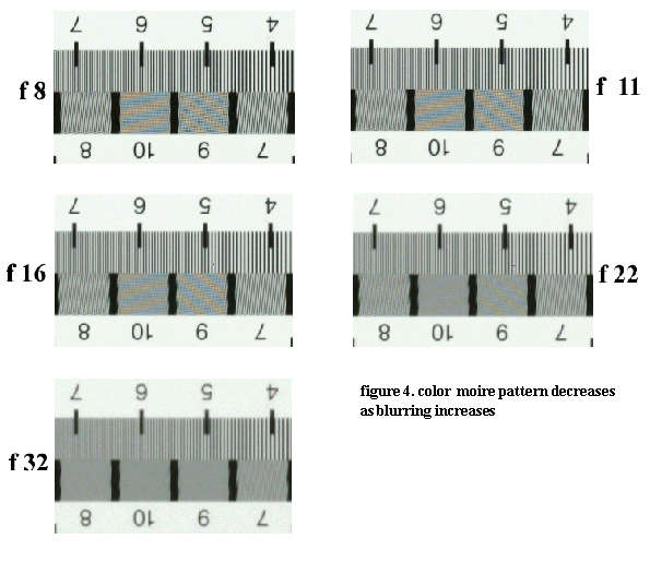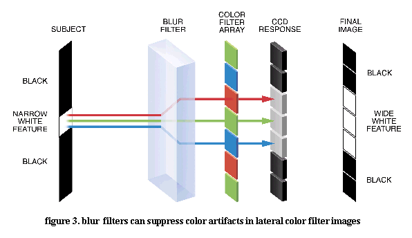 Interpretation errors such as those illustrated in Figure 2 can cause distracting color Moire patterns in some images. To minimize these Moire patterns, some digital cameras have "Anti Aliasing" filters in the optical path to blur out the high spatial frequency patterns (see the discussion of sampling in Digital Camera Tech Notes #2 Pixel Size) , and thereby reduce Moire patterns. This approach is illustrated in figure 3 below.