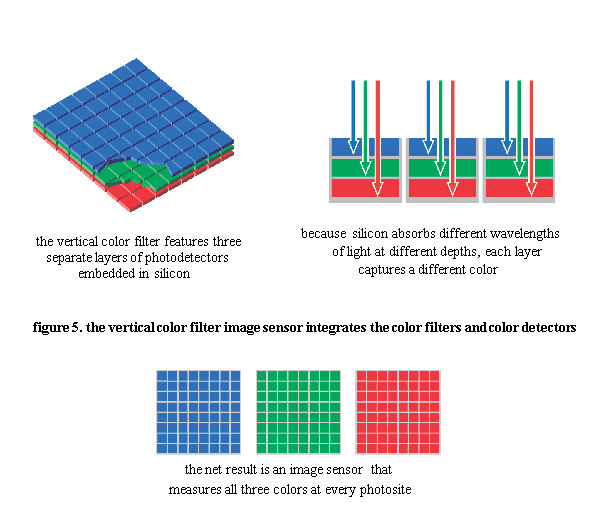 VERTICAL COLOR FILTER Each photosite measures all three colors, using a vertically stacked arrangement of color filters and detectors. Used in color film for over 70 years, and is also possible to implement in electronic image sensors, as shown in figure 5.